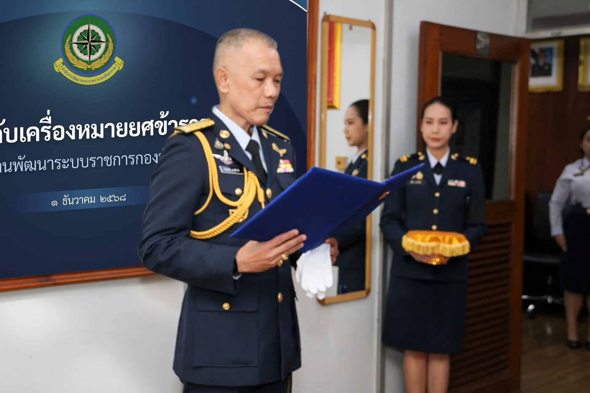 พลอากาศตรีกฤษณ์ เกตุรักษ์ ผู้อำนวยการสำนักงานพัฒนาระบบราชการกองทัพอากาศ เป็นประธานในพิธีประดับเครื่องหมายยศ แก่นายทหารชั้นสัญญาบัตร และนายทหารชั้นประทวน สังกัดสำนักงานพัฒนาระบบราชการกองทัพอากาศ โดยมีนายทหารชั้นผู้ใหญ่ร่วมเป็นเกียรติในพิธี เมื่อวันที่ ๑ ธันวาคม ๒๕๖๘